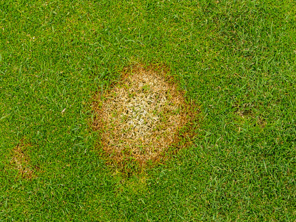 Symptome erkennen: Auf der Rasenfläche erscheinen runde bis unregelmäßige, verfärbte Flecken, die zunächst grau, weißlich oder rosa überzogen sein können. Die betroffenen Gräser wirken matt, verklebt und flach gedrückt. Bei feuchten Bedingungen ist häufig ein watteartiges Myzel sichtbar. Die Flecken vergrößern sich mit der Zeit und können ineinander übergehen. In schweren Fällen stirbt das Gras in diesen Bereichen ab.
